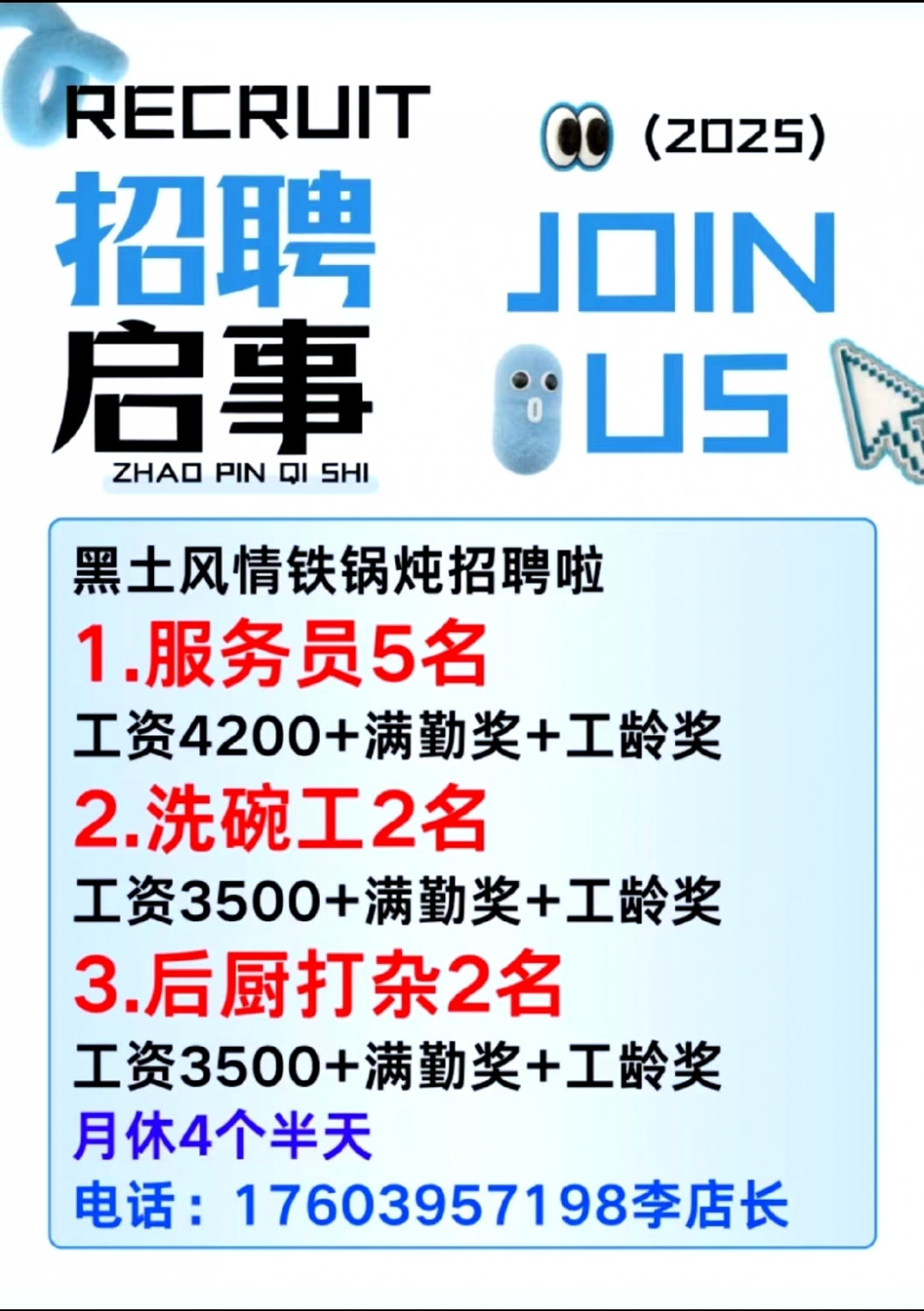 黑土风情铁锅炖招聘啦服务员5名 工资4200+满勤奖+工龄奖洗碗工2名 工...